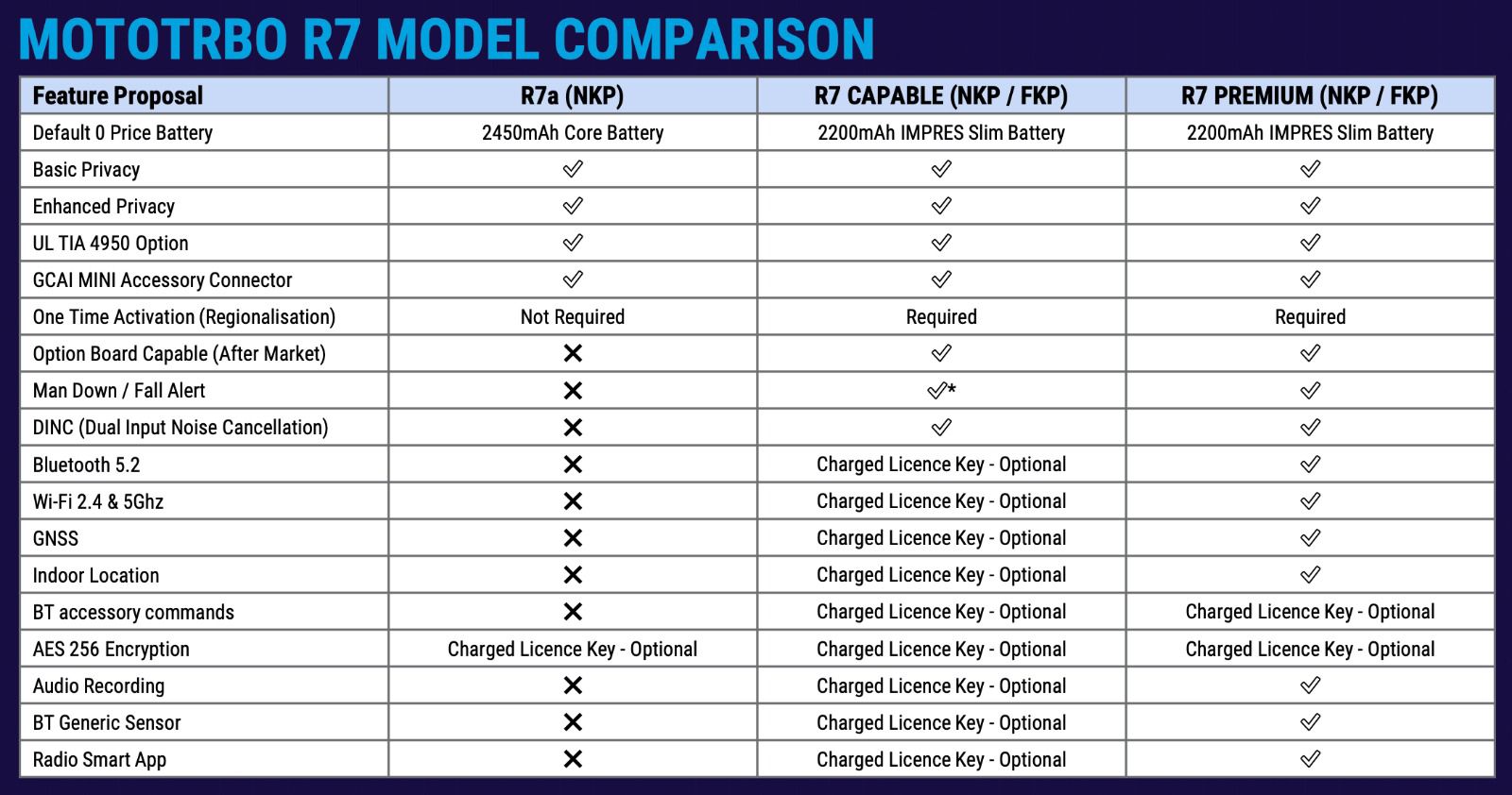 ![]() | Specific versions:R7 PREMIUM FKP and R7 CAPABLE FKP (with display and full keypad): R7 PREMIUM NKP, R7 CAPABLE NKP and R7a NKP (without display and without keypad): General features of R7: |